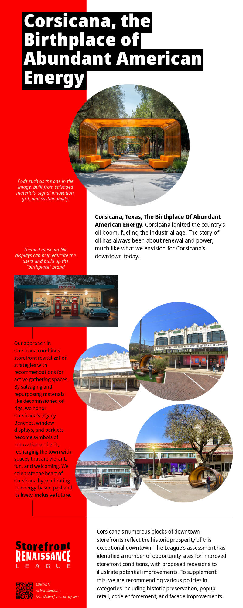 Corsicana TX is located an hour from DFW, on the way to Houston. Its downtown is perfect for a storefront renaissance as a dynamic, walkable hub full of life and opportunity.Storefronts seamlessly blend private entrepreneurship with public vitality. This is where small improvements can spark massive change, drawing visitors, energizing businesses, and shaping the identity of the city.By celebrating its rich history as the birthplace of abundant American energy, The Storefront Renaissance League is helping Corsicana to solidify its legacy while creating an irresistible downtown experience.We conducted a series of assessments of local storefronts and the street level experience, and offered strategic recommendations for upgrading the streetscape and the downtown experience. Get in touch to explore how the Storefront Renaissance League can help your town find its superpowers.